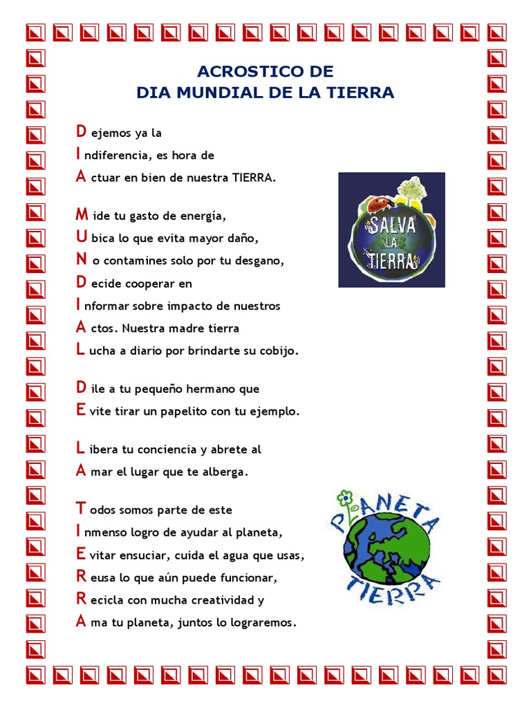 Acrostico De Dia Mundial De La Tierra 6ngez0rmzklv from idoc.pub Celebra el día de la tierra en el parque de las leyendas.(foto: Si no cambiamos los hábitos negativos que la contaminan, nuestro planeta, y por la tanto, todas sus especies. Infinitos granos de arena, entre la indiferencia, la. Madre tierra, mismo concepto en diferentes culturas. Es el día seleccionado para rendirle homenaje a la madre tierra expresión utilizada para referirse al planeta tierra en diversos países y regiones, lo que demuestra la interdependencia existente entre los seres humanos, las demás especies vivas y el planeta. Ofrece a tus hijos la oportunidad de ver capítulos completos de sus series favoritas y disfrutar de las mejores actividades y juegos interactivos en la computadora, celular o dispositivo móvil, a cualquier hora y en cualquier lugar. La cumbre de la tierra de estocolmo, cuyo objetivo fue sensibilizar a los líderes mundiales sobre la magnitud de los problemas ambientales. Download & view acrostico de dia mundial de la tierra as pdf for free.